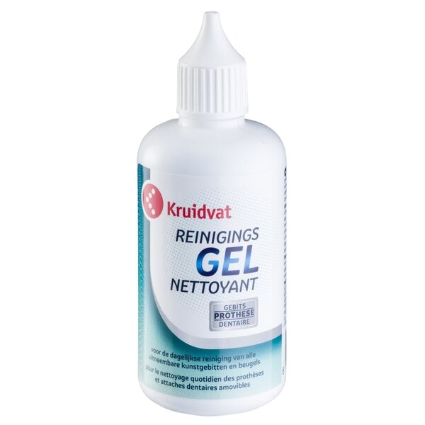 Voor de dagelijkse reiniging van alle uitneembare kunstgebitten en beugels gebruik je Kruidvat Prothese Reinigingsgel.